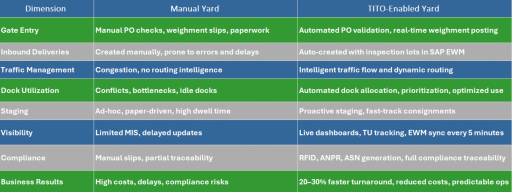 At its core, TITO integrates tightly with SAP systems to enable a single source of truth for yard logistics: